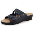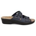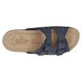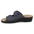 Ciabatte donna collezione primavera/estate. Tomaia in pelle color blu con doppia fibbia regolabile per una migliore calzata al piede. Sottopiede imbottito in vera pelle anatomico, anti-shock, automodellante e antiscivolo.