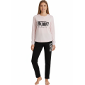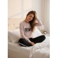 Design alla moda con maglia a manica lunga color rosa chiaro con stampa sul davanti e collo due bottoni. Pantalone lungo nero con scritta sulla gamba e banda laterale a contrasto, per un look sportivo e trendy.