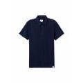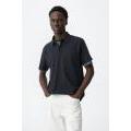 Polo blu scuro, vestibilità regolare, maniche corte, colletto classico e sovrapposizione a righe.