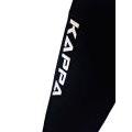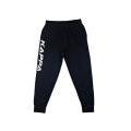 Pantalone tuta da uomo in cotone garzato di colore nero con girovita elastico, tasche laterali e fondo dritto con elastici. Dettaglio laterale con scritta bianca.