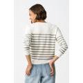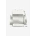 T-shirt bianca a maniche lunghe con strisce nere, vestibilità comoda e bottoni sulla spalla.