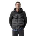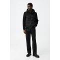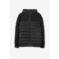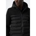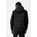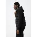 Giacca trapuntata nera con cappuccio, cerniera frontale e discrete tasche laterali. Vestibilità regolare.