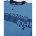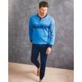 Pigiama da uomo in caldo cotone Il Granchio. Composto da maglia color aviazione con scollo serafino e maniche con polsini; pantaloni tinta unita blu elasticizzati in vita e polsini alle caviglie.