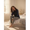 Pigiama da donna in cotone interlock, composto da maglia con scollo serafino e pantalone tinta unita con polsino.