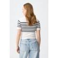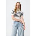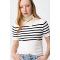 Maglione bianco sporco con strisce nere, vestibilità slim, maniche corte e collo alto, stile casual chic.