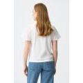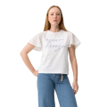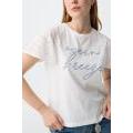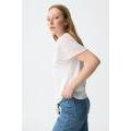 T-shirt bianca, vestibilità regolare, maniche corte in pizzo e la frase "ocean breeze" ricamata sul davanti.