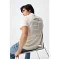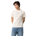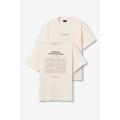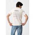 T-shirt beige, taglio dritto, dettagli minimali sul davanti e scritta stampata sul retro.