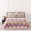 Trapuntino In Cotone Stampato Arben Il trapuntino Arben in cotone stampato interpreta lo chevron in chiave morbida e contemporanea, con un disegno delicato dal segno pittorico leggero ed etereo, come tracciato da pennellate ad acquerello. Il fronte in 100% cotone accoglie sfumature armoniose che donano movimento al letto senza risultare invasive, mentre il retro in madapolam di cotone tinta unita bilancia la composizione con naturalezza. Il risultato è un’estetica raffinata, pensata per ambienti luminosi e rilassanti. L’imbottitura in 100% poliestere da 120 GSM rende il quilt leggero e piacevolmente avvolgente, ideale per la mezza stagione o come copertura decorativa quotidiana. La trapuntatura a rombi da 5,5 cm con angoli tondi e chiusura a sbieco valorizza il disegno e assicura una distribuzione uniforme dell’imbottitura Misura 220 X 270 IMBOTTITURA 120 GSM MADED IN ITALY
