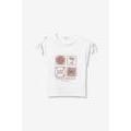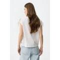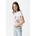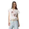 T-shirt color bianco vestibilità regolare, con laccetti sulle maniche e stampa vintage nei toni della terra sul davanti.